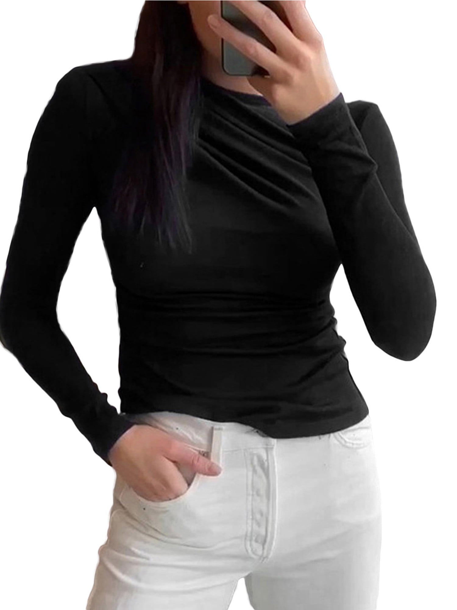Sunisery Women Ruched Long Sleeve Tight Crop Tops Fall Casual Solid Color Slim Fit Oblique Collar Pullover Tee Shirt Black S Walmart Com
